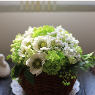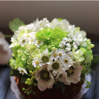 HOME > 商品詳細 > 商品詳細A-15 Details アネモネやスノーボールなどのホワイト×グリーンアレンジです。インテリアやギフトにおススメです、 Size 最大幅 20㎝ 高さ 18㎝ Price ¥7,300-クリアボックスに入れてお届けします。