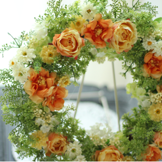 HOME > 商品詳細 > 商品詳細A-34 Details オレンジやイエローのローズと数種類のリボングリーンが入ったナチュラルリースです。インテリアやギフトにおススメです。お部屋の雰囲気が明るくなります♪ Size 最大幅 28㎝ 高さ 30㎝ Price ¥8,500-リースボックスに入れてお届けします。
